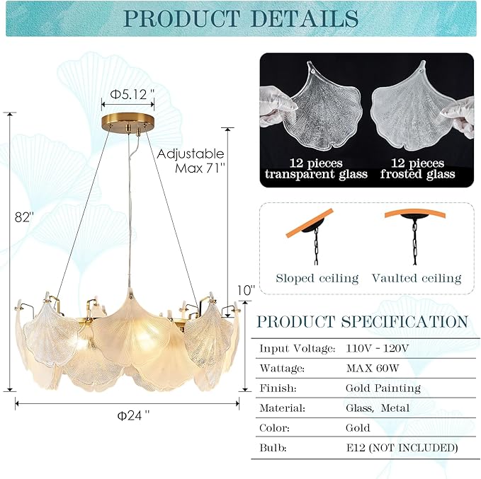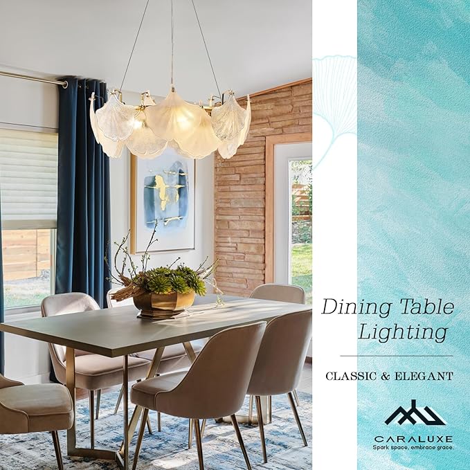 - Gold Glass Chandelier Light Fixture - Caraluxe gold dining room chandelier is made from a rust-proof metal frame and thickened ginkgo glass shades, brings durable and also sophisticated lighting experience.