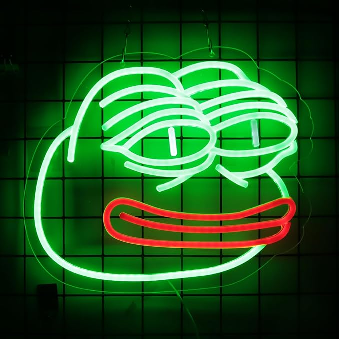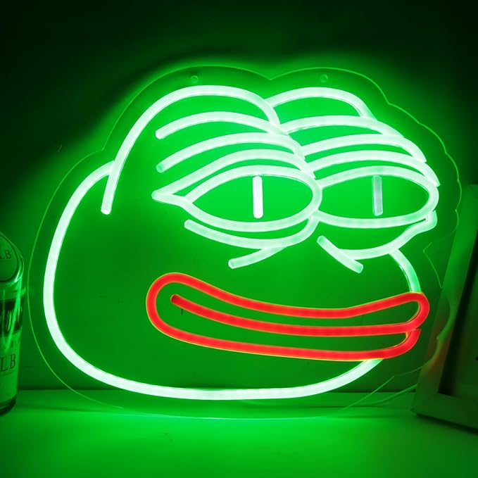 - Introducing our Pepe Frog neon sign, the perfect addition to any room or space. This vibrant neon sign features the iconic Pepe Frog character in bright green, outlined with bold white neon. Made with high-quality materials, this neon sign is designed to last and bring a touch of fun and nostalgia to your decor. Ideal for bedrooms, game rooms, or home offices, our Pepe Frog neon sign is sure to catch the eye and add a pop of color to any setting. Shop now and brighten up your space with this trendy and unique neon sign!