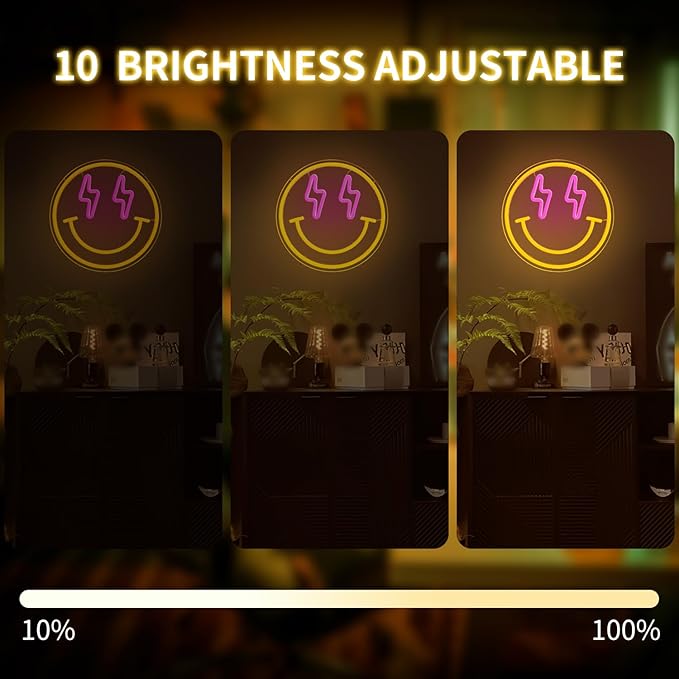- Adjustable Brightness: You can adjust the neon light sign brightness from 10% to 100%, which is meeting your different lighting needs. Smile face led wall decor warm light will brighten up your bedroom