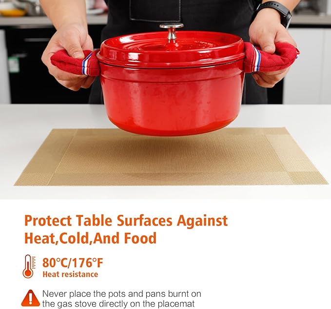 - 👍Features&Care:Our dining table mats are heat,washable,non slip, fade resistantand stain resistant.But liquid will go right through it and NOT waterproof. What's more, our table mats Max heat-resistant temperature is to 176°F (80°C).We recommend that you do not iron our table mats.