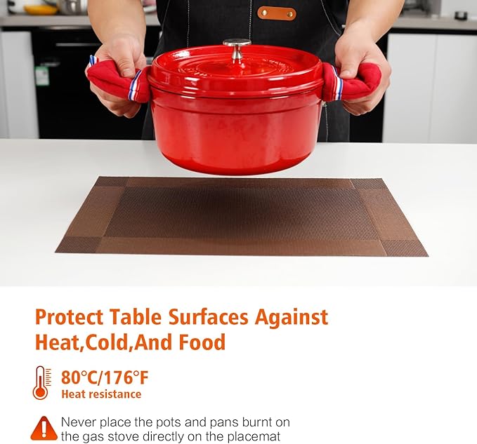 - 👍Features&Care:Our dining table mats are heat,washable,non slip, fade resistantand stain resistant.But liquid will go right through it and NOT waterproof. What's more, our table mats Max heat-resistant temperature is to 176°F (80°C).We recommend that you do not iron our table mats.