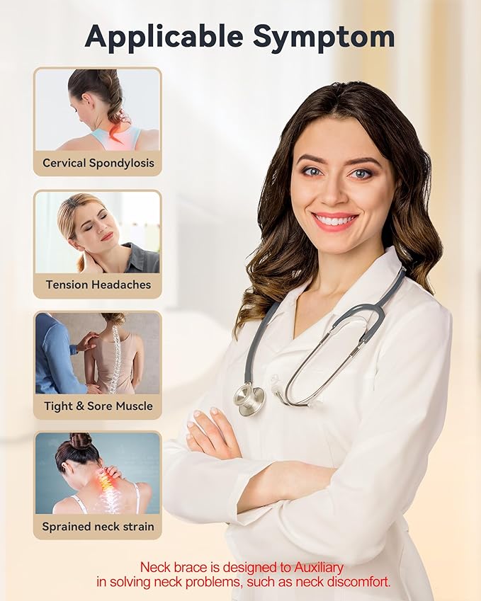 - Neck Pain Relief and Injury Support:Our cervical collar supports the jaw and neck while limiting mobility to relieve pain and pressure in the spine, realigning and stabilizing vertebrae. The non-rigid neck brace will also relieve headaches caused by cervical strains and sprains. Perfect for sore neck, sprains and strains, muscle pain, spinal pain, and neck injury support.