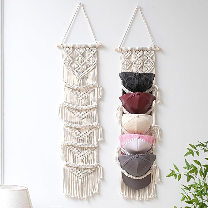 - Versatile Macrame Cap Hanger: this baseball cap hanger is not just a storage, it doubles up as Bohemian style wall art; Its attractive design, detailed pattern making it a focal point in any room; Hang your baseball hat hanger for wall in the room, living area or anywhere you want to add some texture and interest
