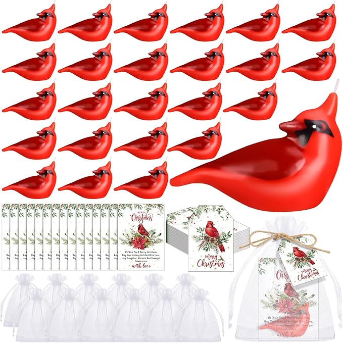 - Sufficient Quantity for Holiday Sharing: the package contains 24 3D cardinal bird candles, 24 organza bags, 24 large cards and 24 punched label gift cards; 24 twine are included, which is sufficient for you to have enough gifts to share with others; The candles that express the joy of Christmas can make the space full of festive atmosphere and serve as beautiful decorations in various places in the home during Christmas to convey warmth and happiness
