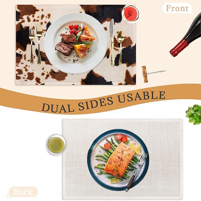 Cow Print Placemats Set of 6,Washable Heat Resistant 12×18 Inch Linen Table Mats Farmhouse Place Mats for Party Outdoor Dining Décor