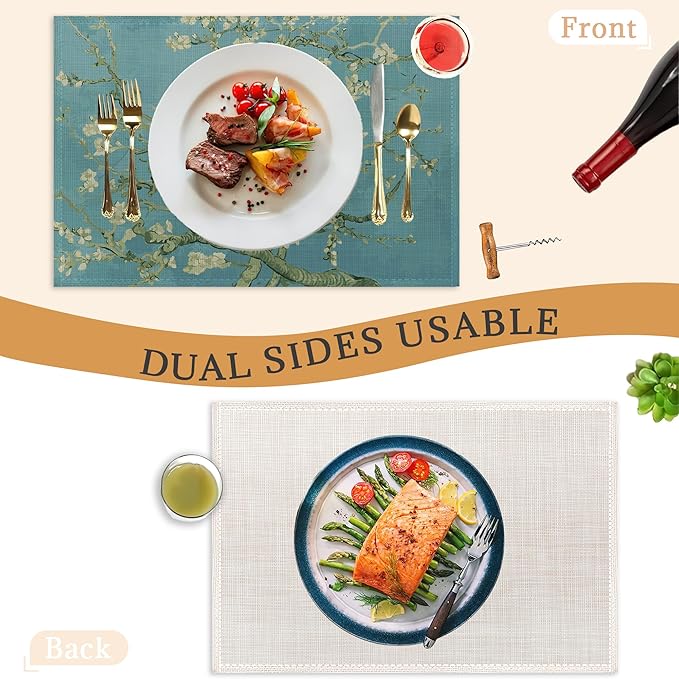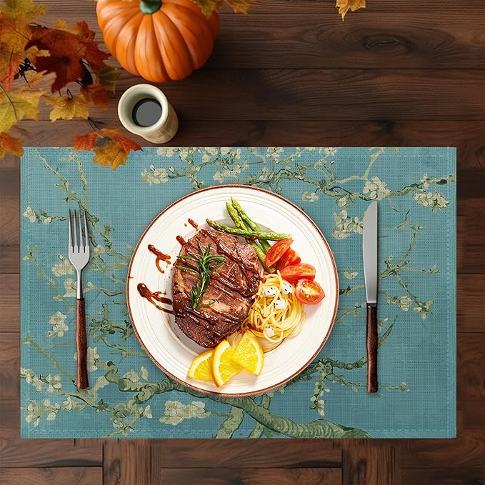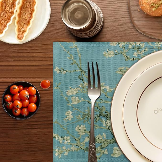 Almond Tree in Blossom Placemats Set of 6,Washable Heat Resistant 12×18 Inch Linen Table Mats Art Place Mats for Party Outdoor Dining Décor