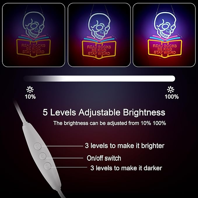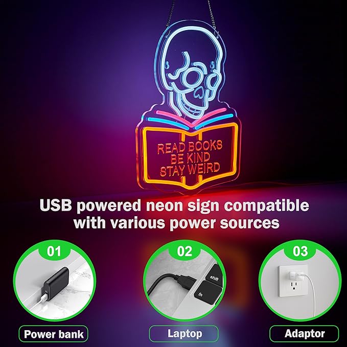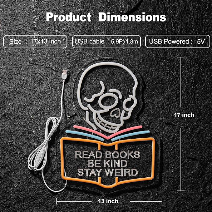 Read Books Be Kind Stay Weird Neon Sign for Wall Décor Dimmable LED Skull Neon Light USB Powered Neon Art Signs Decor