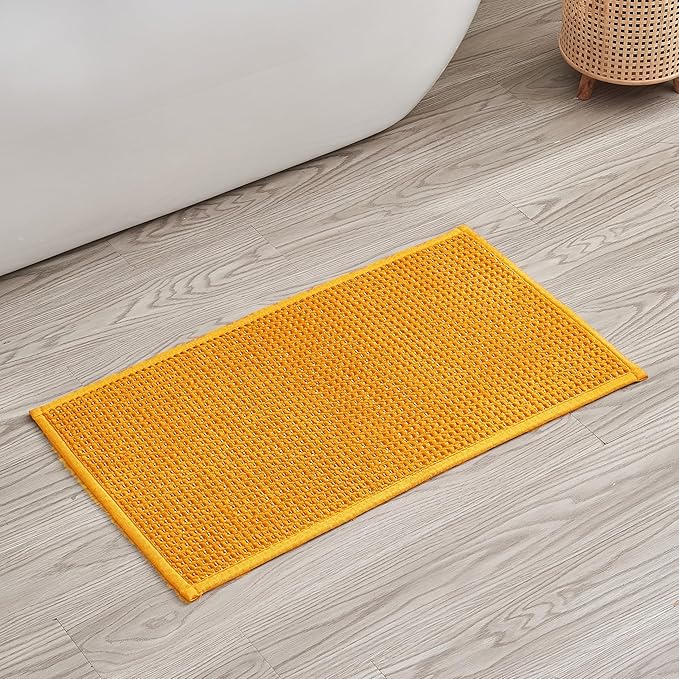 Douceur Chenille Waffle mat with Patented noslip Backing, Acrylic Blend Chenille Absorbent Bathroom Rugs, Cushioned mesh Backed Bath Rug Machine Washable, 18" x 32", Mustard Yellow