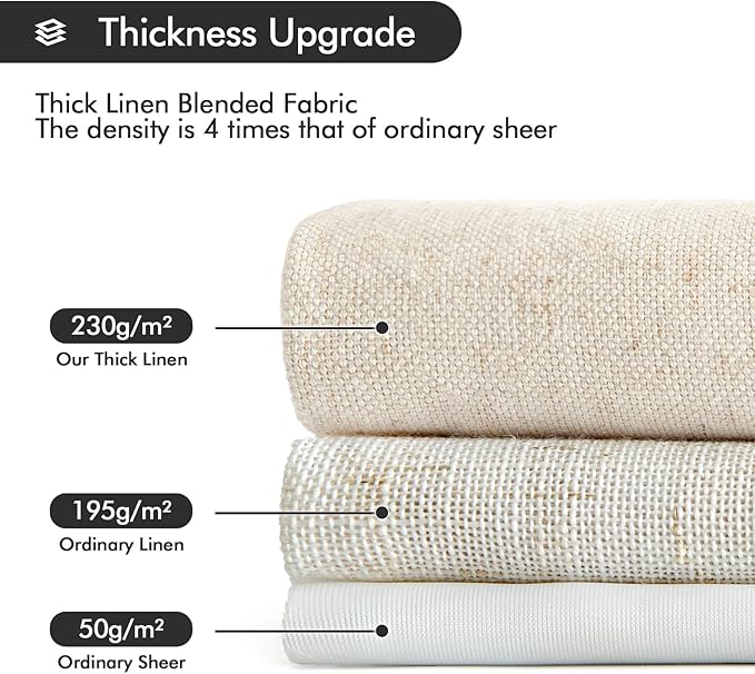 - LINEN BLENDED: Made of 230 GSM flax linen fabric, which is more soft-touch and durable and natural aesthetics. Compared with plain polyester curtains, thicker linen curtains capture cross-woven fabric design bring a rich linen texture look and add a classic and sophisticated charm to your window