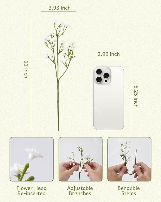 - ENJOY TO DIY: The faux babys breath flowers can be used with various kinds of artificial flowers. The stems are made of wire, wrapped in plastic, the length is 11.02 inch and the shape of the stems can be freely adjusted, so that you can make flower arrangement or DIY wreath according to personal preferences.
