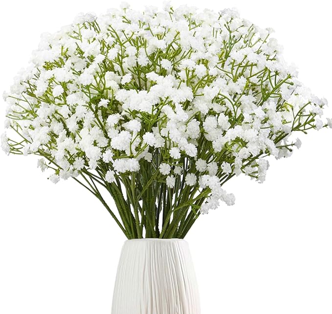 - WHAT YOU GET: You will receive 24pcs fake baby breath flowers, a great small vase filler. The white faux gypsophila are perfect for home decor, festival decorations, greenery garlands and any other special occasion. Note: the main picture is the effect for 48pcs(2 packs), if you want the same effect, please order 2 packs or more.