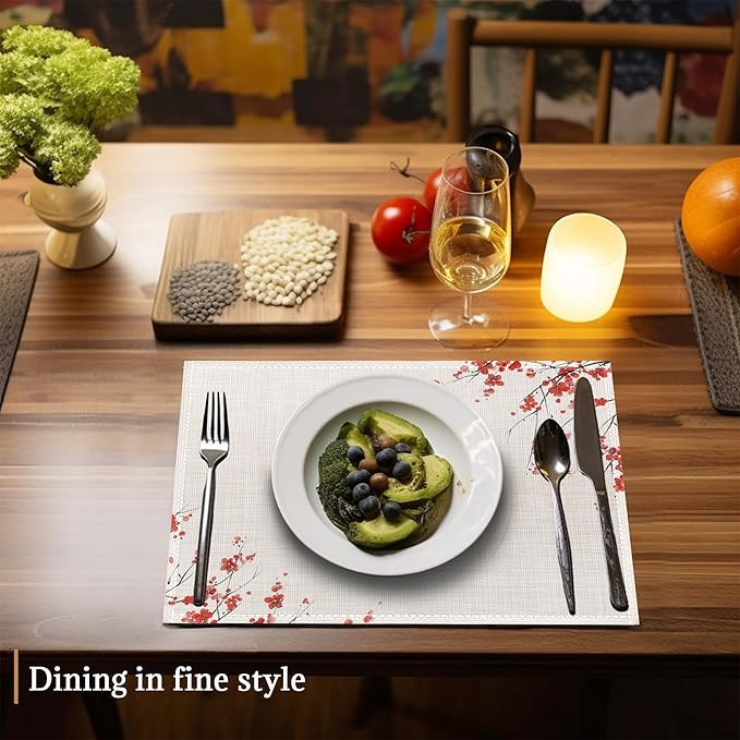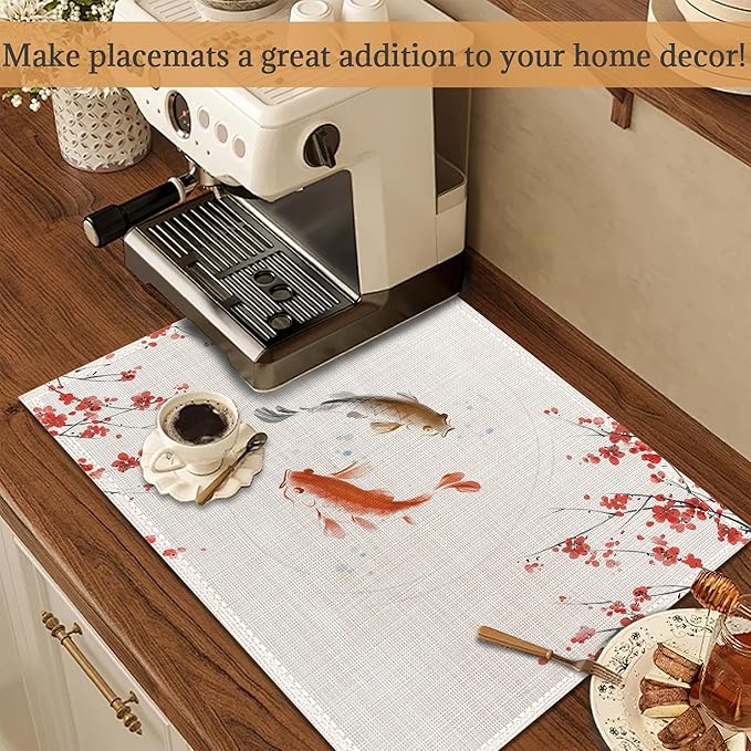 Japanese Cherry Blossom and Fish Placemats Set of 6 Place Mats for Kitchen Table Washable Farmhouse Linen Table Mats Dining Decoration 12x18 Inch