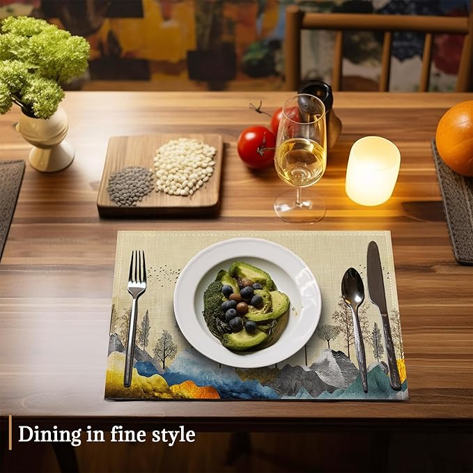 Trees with Mountains Placemats Set of 6 Washable Table Mats for Kitchen Dining Table,Heat-Resistant Place Mats for Indoor Outdoor Party Holiday Decoration(Landscape)