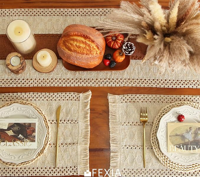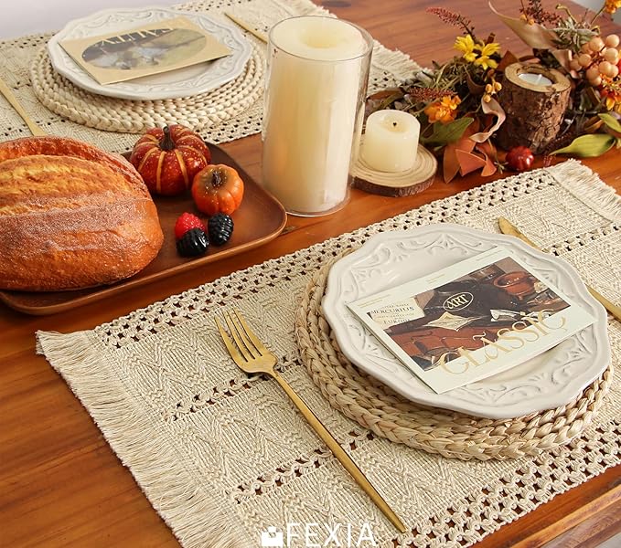 FEXIA Boho Placemats Set of 4, Macrame Table Decor and Farmhouse Style Placemats Natural Cotton Burlap, for Dining Table, Beige