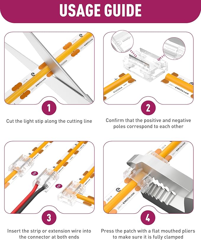 - QUICK AND EASY INSTALLATION: Just cut the light strip along the cutting line and insert the strip or extension wire into the connector on both ends, then press the patch with plier to pierce through the strip to complete the connection without soldering