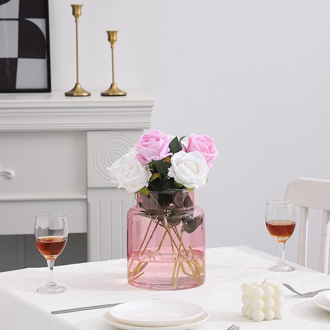 Large Glass Vase, 7 Inch Pink Glass Vase, Large Flower Vases for Bouquet, Wide Mouth Vases for Flowers, Home, Wedding, Living Room, Office Decor
