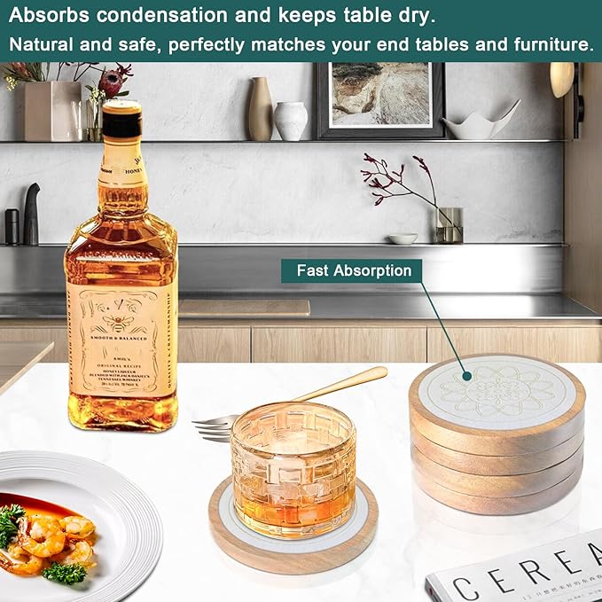 - 🍻Super Absorbent Coasters: Wooden coasters with built-in thickened felt pads for stronger water absorption and heat insulation, capture liquids quickly were prevent any spills, keeping your tabletop clean and tidy, with no stains and water rings; extra large size easily accommodates cups of all sizes.