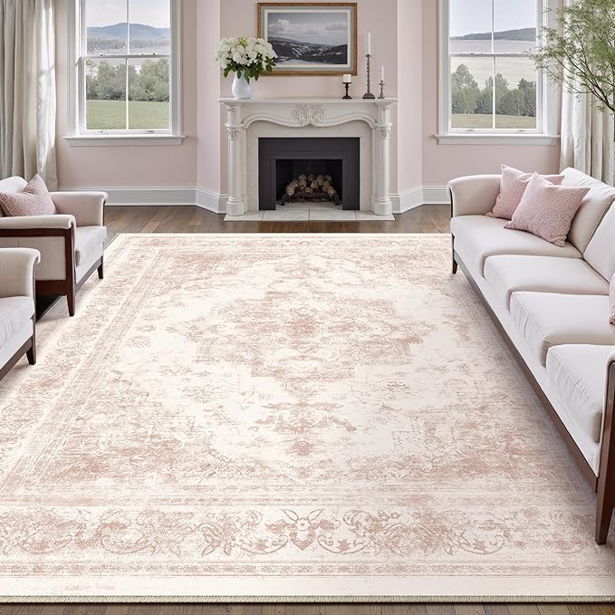 Washable Rug 8x10 Area Rug for Living Room Pink Vintage Boho Medallion Large Distressed Retro Carpet Non Slip Indoor Low Pile Small Soft Bedroom Dining Room Home Office