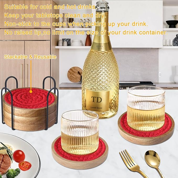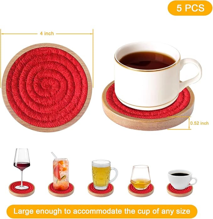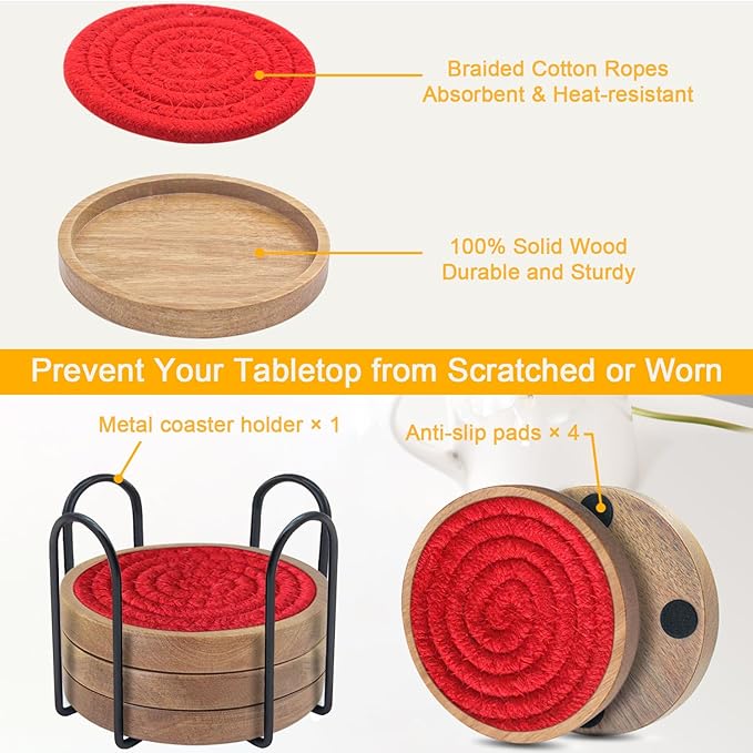 Woven Coasters Set of 5 with Holder, Wooden Drink Coasters for Coffee Table, Housewarming Gift for Farmhouse Home Decor, 4 inches (Red)