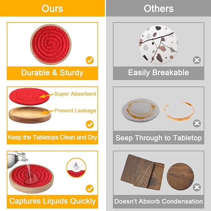 - 【Coasters with Holder】: Original Design & Patented Product, super absorbent coaster set comes with a practical metal holder for easy storage; the coasters are woven inserts and wooden base construction that can absorb a larger amount of condensation and ensure moisture does not permeate on the table, keep the table dry to prevent stains or water rings.
