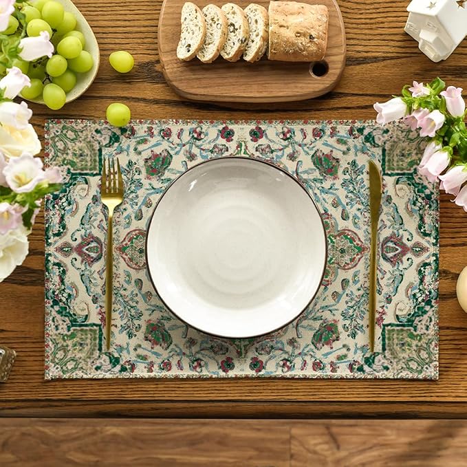 Artoid Mode Boho Placemats Set of 4, Daily Green Floral Bohemian Fall Table Mats for Home Party Dining Decoration 12x18 Inch