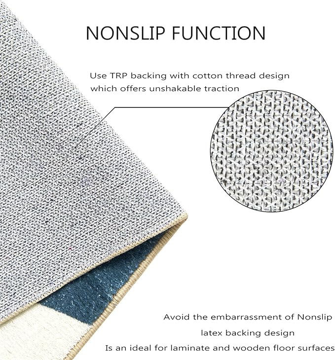 - [NON SLIP TPR BACKING] -- The non-slip TPR backing prevents slipping, tripping and holds the aesthetic accent rug more firmly in place. This blue rug used upgraded material makes mat odor-free and protect your floors from moisture and scratches