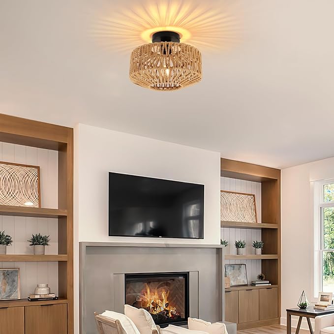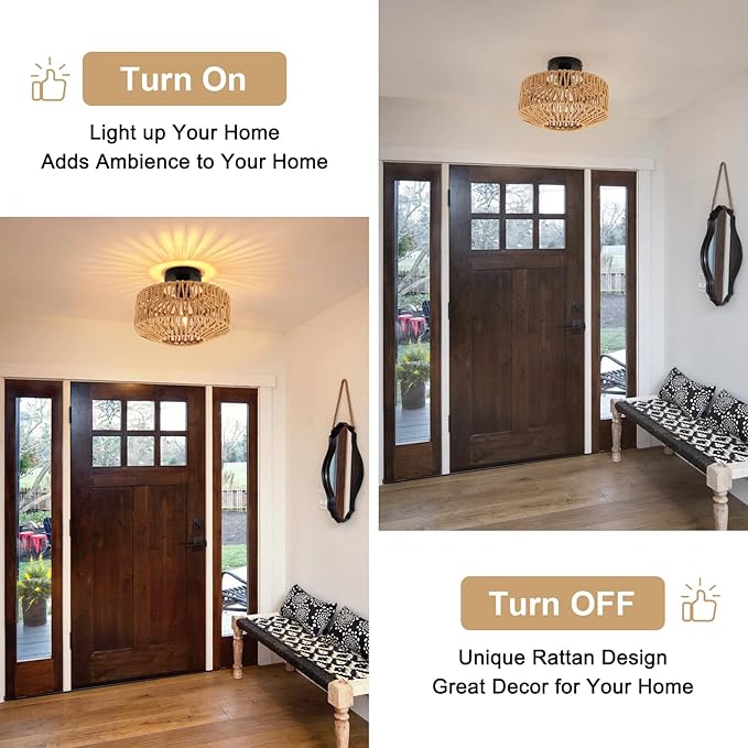 - 360° Light Effect: The coastal rattan ceiling lamp casts 360° light effect shadow through the holes and provides a cozy soft glow when turn on. Elegant and beautiful accent lighting for living room, bedroom, kids room, kitchen, farmhouse, nursery