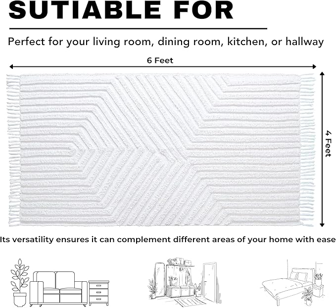 - Unique & Tufted Rugs: Hand tufted with a half inch of soft pile height that deliver a seriously soft touch to your floor and withstands high traffic. Due to hand-woven, there may be errors, the edges are not so straight. Size 48x72 inch(4x6 feet) White color