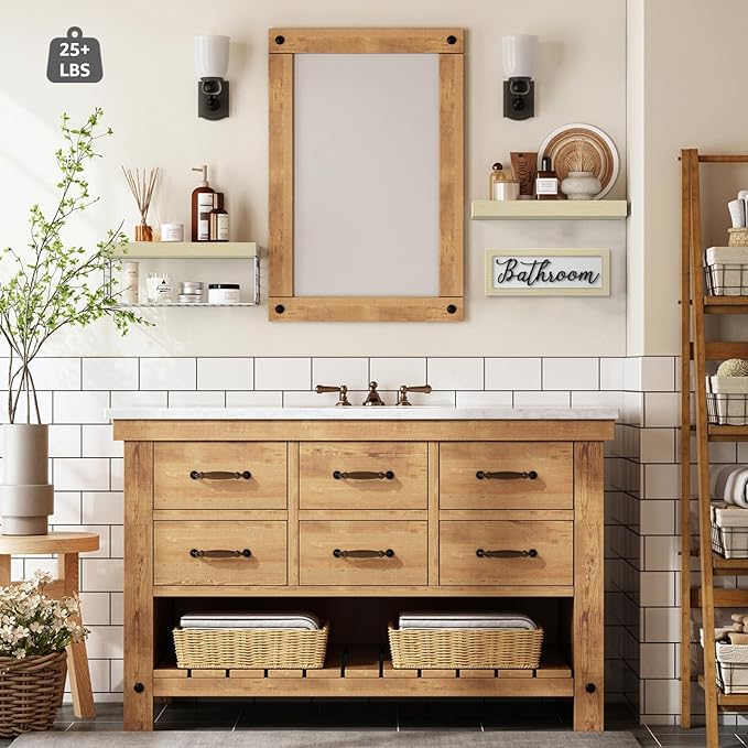 - Patent Design: Create a farmhouse oasis in your bathroom with decor sets! Includes 2 floating shelves, 1 basket, and 1 decorative sign