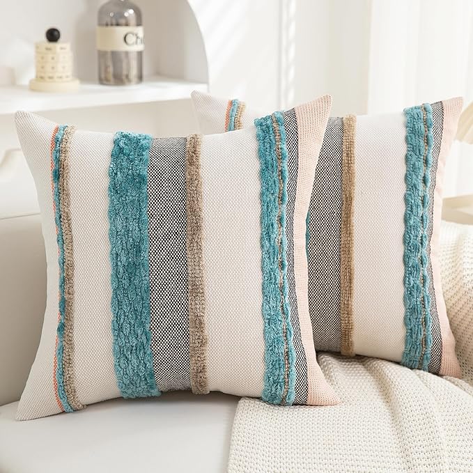 Boho Pillow Covers 18x18 Set of 2 for Couch-Modern Farmhouse Sofa Decorative Teal Throw Pillow Covers Textured Chenille Cushion Covers Outdoor Netural Bohemian Pillow Cases Square