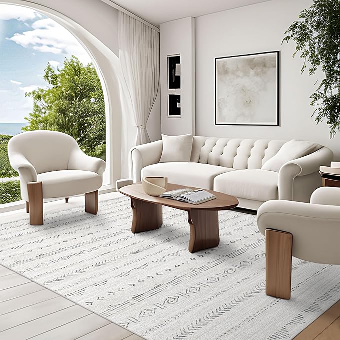- Decorative Living Room Rugs: A neutral bohemian pattern paired with white and light grey gives this 5x8 rugs for living room a sophisticated look while adding a touch of elegance. This 5x8 rug can complement various decor, making it a standout piece in any room. Note: When you receive a new throw rug with a crease, you could try rolling it up the opposite way for two full days, then laying it flat on a clean floor.