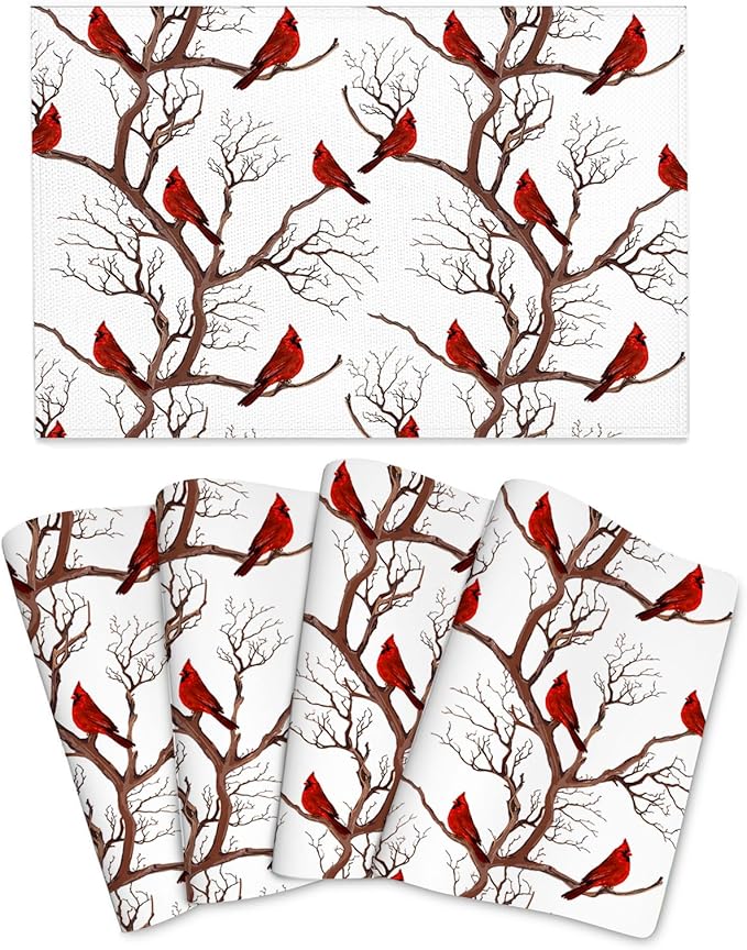 Winter Cardinal Christmas Placemats Set of 4, Red Decorative Place Mats 12x18 Inch Washable Heat Resistant Table Mats for Kitchen Dining Tables Holiday Party Farmhouse Home Decor
