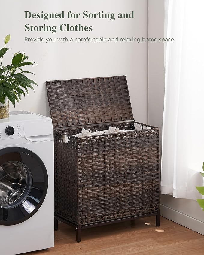 Laundry Hamper with Lid 132 L, (35 Gallons) Clothes Hamper with Lid, Handwoven Rattan Laundry Hamper with Metal Heightened Feet, Laundry Hampers with 3 Removable Liner Bags for Laundry-Brown