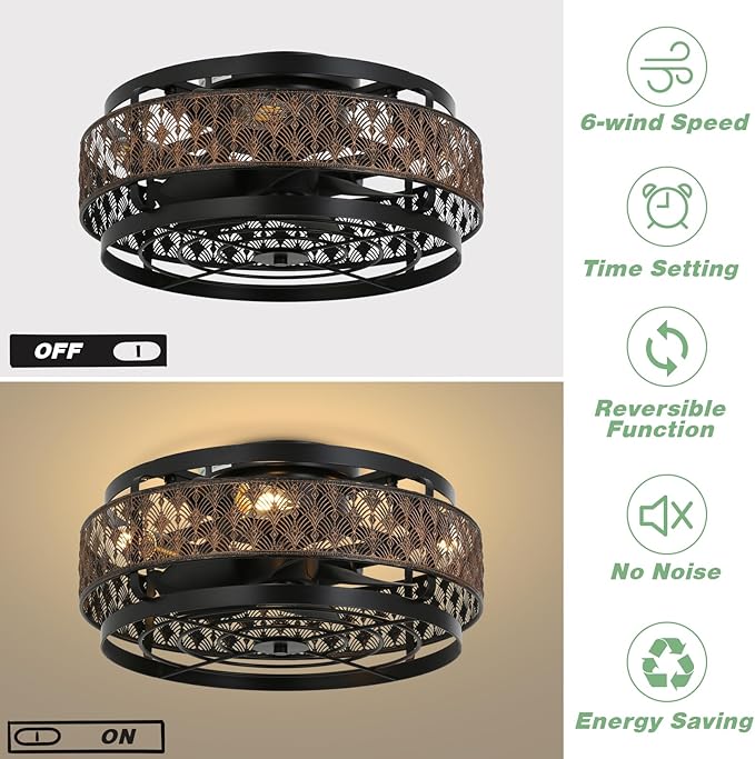 - 【REMOTE CONTROL】Caged ceiling fans with simple and exquisite design, suitable for industrial style or country style indoor collocation. All operations can be controlled by the remote control, with 6 levels of adjustable wind speed, you can choose the appropriate wind strength according to your preferences and needs. Additionally, to better suit your needs, it features a timer function that allows you to set the fan to run for 1, 2, or 4 hours. The fans and lighting function can be turned on individually.