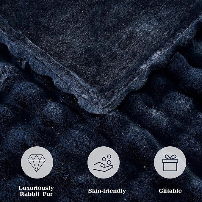 JONIYEAR Soft Fuzzy Oversized Bubble Faux Rabbit Fur Throw Blanket 60" x 70", Reversible Solid Thick Warm Fluffy Blanket for Winter, Luxe Cozy Puffy Shaggy Furry Blankets for Bed, Twin Size, Navy Blue