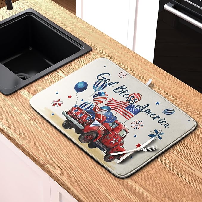 4th of July Drying Mat for Kitchen Counter 16 x 18 US Independence Day Patriotic Truck Dish Drying Mat Polyester American Flag Dish Drainer Mat Super Absorbent Dish Rack Pad for Coffee Bar Sinks