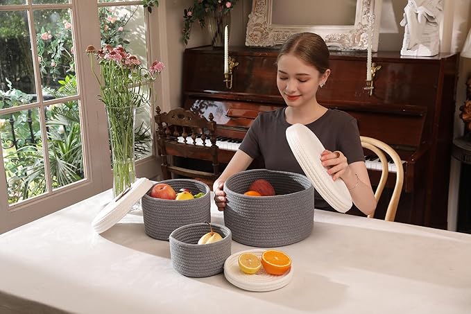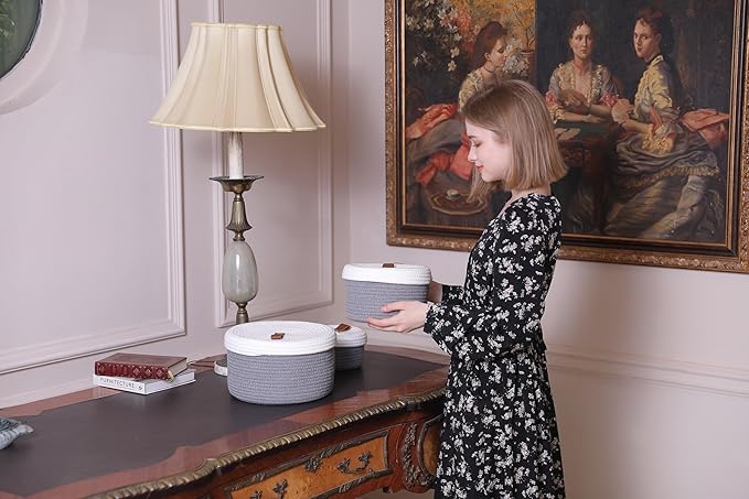 Cottonphant Set of 3 Stylish Round Woven Baskets with Lids - Elegant Storage Solution for Home Decor and Organization - Compact Shelf Baskets (Grey/White Lid, 10"x6"-8"x5"-6"x4")