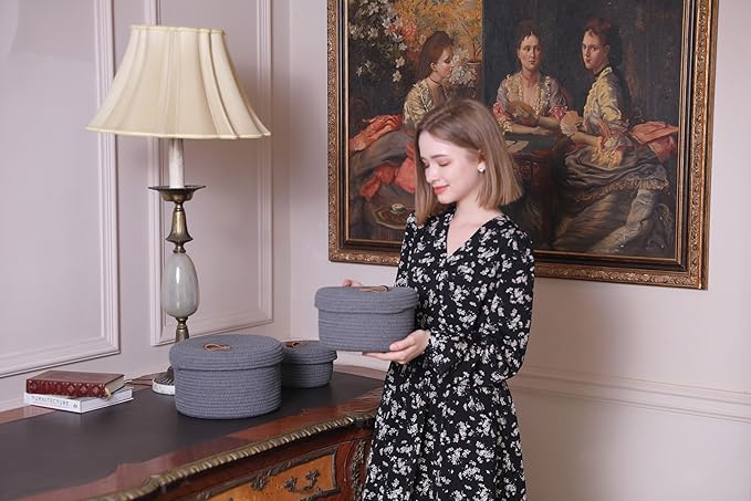 Cottonphant Set of 3 Stylish Round Woven Baskets with Lids - Elegant Storage Solution for Home Decor and Organization - Compact Shelf Baskets (Dark Grey, 10"x6"-8"x5"-6"x4")