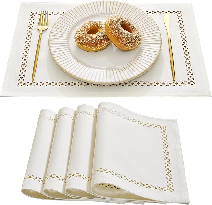 Burlap Placemats Set of 4, 12 x 18 Inch Rustic Geometric Hollow Place Mats, Heat Resistant Placemats for Farmhouse Kitchen Table Decor, Off White 4PCS