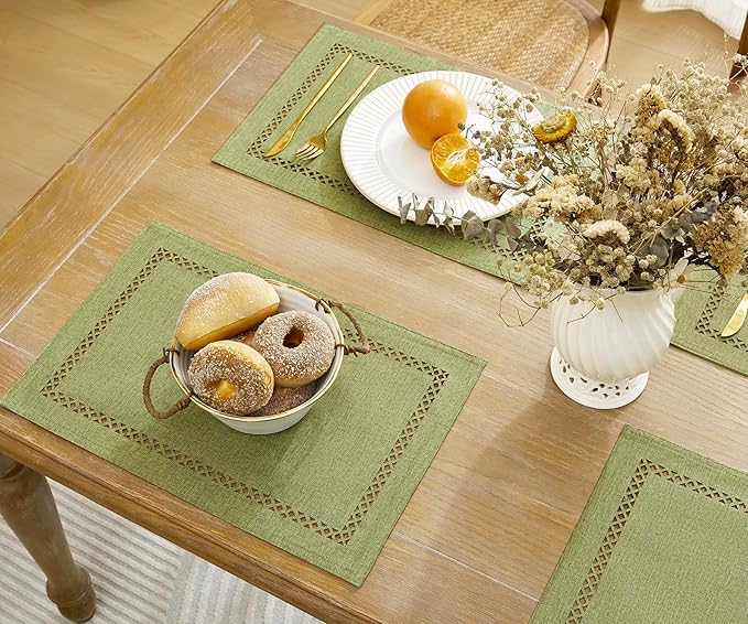 Burlap Placemats Set of 6, 12 x 18 Inch Rustic Geometric Hollow Place Mats, Heat Resistant Placemats for Farmhouse Kitchen Table Decor, Sage Green 6PCS