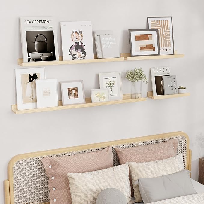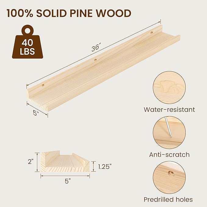 Picture Ledge Shelf, Solid Pine Wood Rustic Floating Shelves for Wall, 36 Inch Long Floating Shelves with Lip for Bedroom Kitchen Living Room Nursery Display, Set of 2 (Natural)