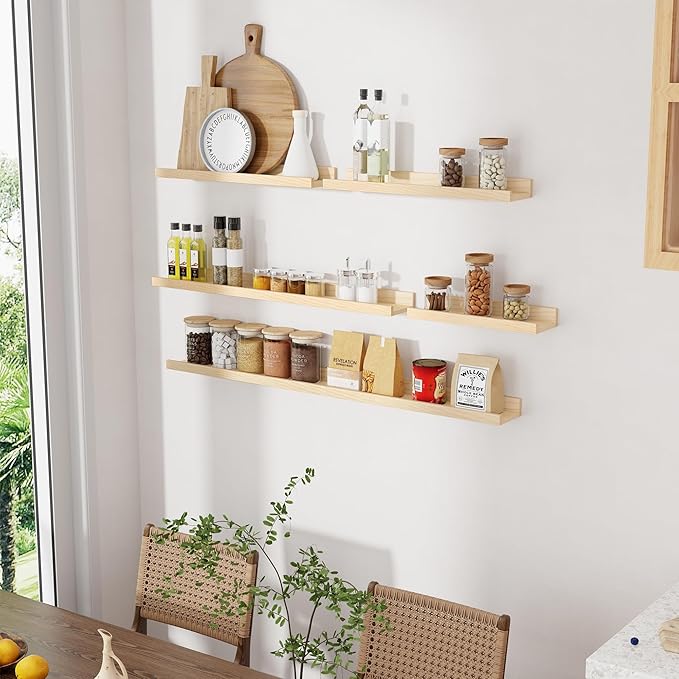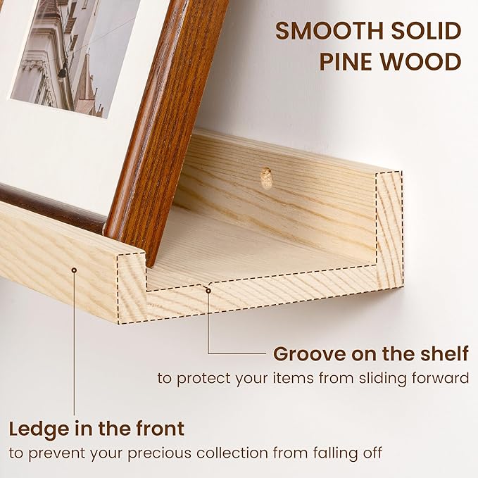 - FRONT LIP & GROOVE - Vivelove Solid Pine Wood Picture Ledge Shelves Featuring a carefully designed front lip and a shallow groove behind the lip, our ledge shelves offer additional protection from slipping or falling, and hold the items in place to maintain a clean, uncluttered aesthetic.