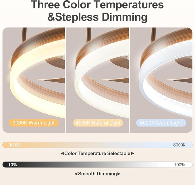 - [3-color temperatures&Stepless Dimming]: This bladeless ceiling fan with lights has 3000K, 4500K, and 6000K 3-color temperatures, in addition, the LED strip can also provide stepless dimming, so you can choose the most suitable brightness to create the ideal atmosphere.