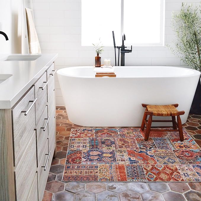 4x6 Rug for Kitchen,Washable Non Slip Patriotic Decor Small Boho Area Rug for Bathroom Bedroom Living Room Indoor Entrway Ultra Thin Fit Under Door,Terracotta Rust Burnt Orange Red and Navy Blue