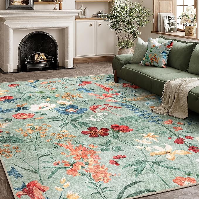 Green Area Rug 6x9 Floral Washable Living Room Kitchen Boho Carpet Non Slip Low Pile Indoor Accent Lightweight Soft Throw Rug for Bedroom Office Dining Room Nursery Farmhouse