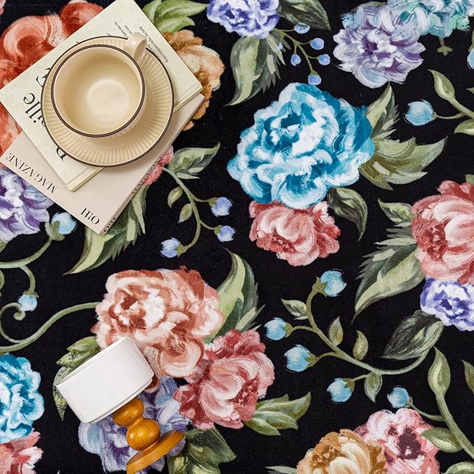 Black Area Rug 2x3 Floral Entryway Entrance Door Mat Indoor Non Slip Kitchen Carpet Washable Bedroom Small Low Pile Accent Rug for Office Living Dining Room Bathroom Farmhouse