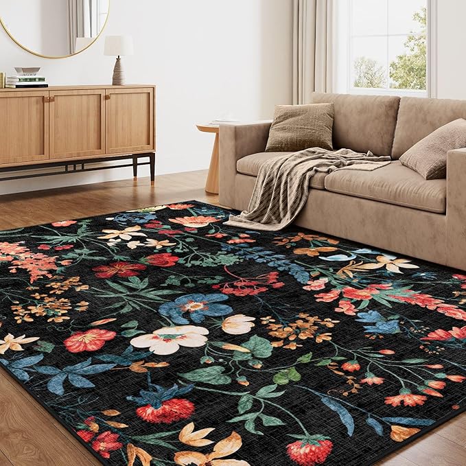 Black Area Rug 5x7 Floral Washable Living Room Kitchen Boho Carpet Non Slip Low Pile Indoor Accent Lightweight Soft Throw Rug for Bedroom Office Dining Room Nursery Farmhouse
