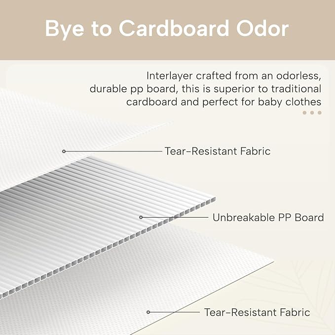 - Durable Design: Crafted from sturdy non-woven fabric, these dresser drawer organizers feature high-quality stitching for enhanced durability. Reinforced with heavy plastic boards on the sides, these bins maintain their shape over time. They are also odorless, making them ideal for storing baby clothes