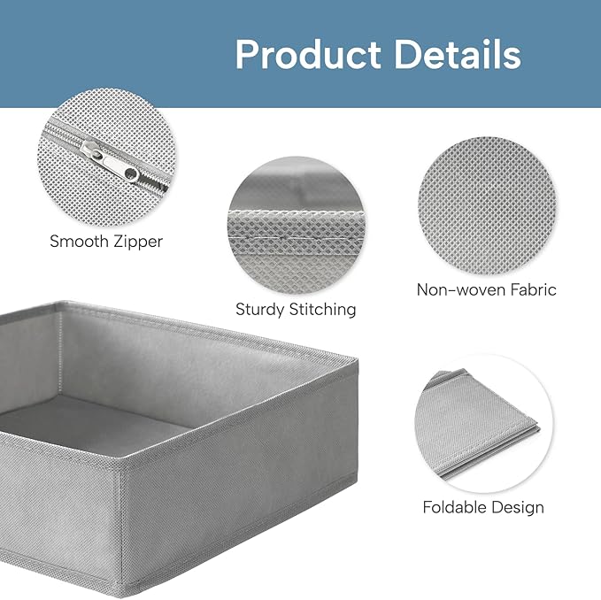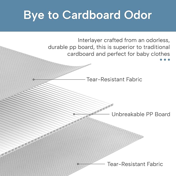 - Durable Design: Crafted from sturdy non-woven fabric, these dresser drawer organizers feature high-quality stitching for enhanced durability. Reinforced with heavy plastic boards on the sides, these bins maintain their shape over time. They are also odorless, making them ideal for storing baby clothes