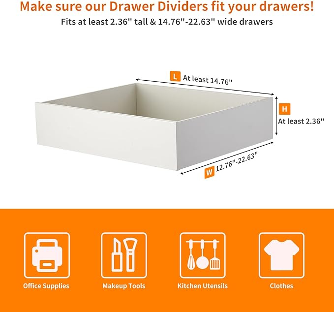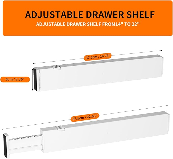 - Drawer organizer are 0.6" wide, 2.36" high, adjustable in length from 14.76" to 22.36". Adjustable drawer dividers fit easily into most drawers and cabinets.